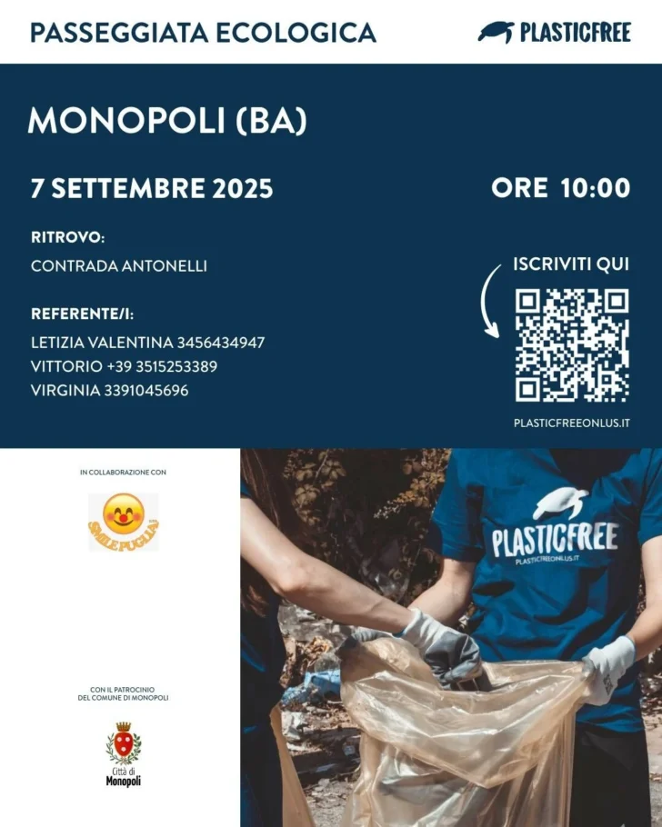 Il Comune di Monopoli, attraverso l’Assessorato all’Ambiente, promuove una nuova giornata di pulizia ambientale in collaborazione con l’associazione Plastic Free Onlus e con il supporto di Smile Puglia, con l’obiettivo di sensibilizzare la cittadinanza sull’importanza della tutela del territorio e sulla necessità di contrastare l’abbandono dei rifiuti.