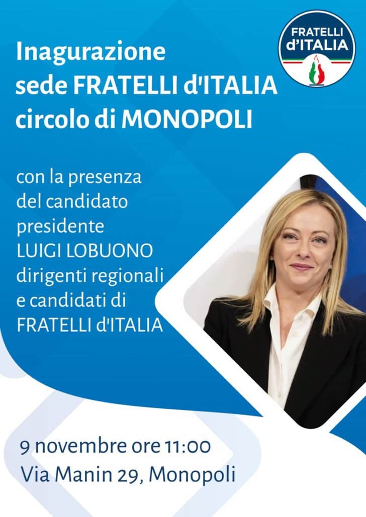 Fratelli d’Italia annuncia l’inaugurazione del proprio circolo cittadino a Monopoli, un evento che segna un nuovo presidio territoriale del partito nella città.