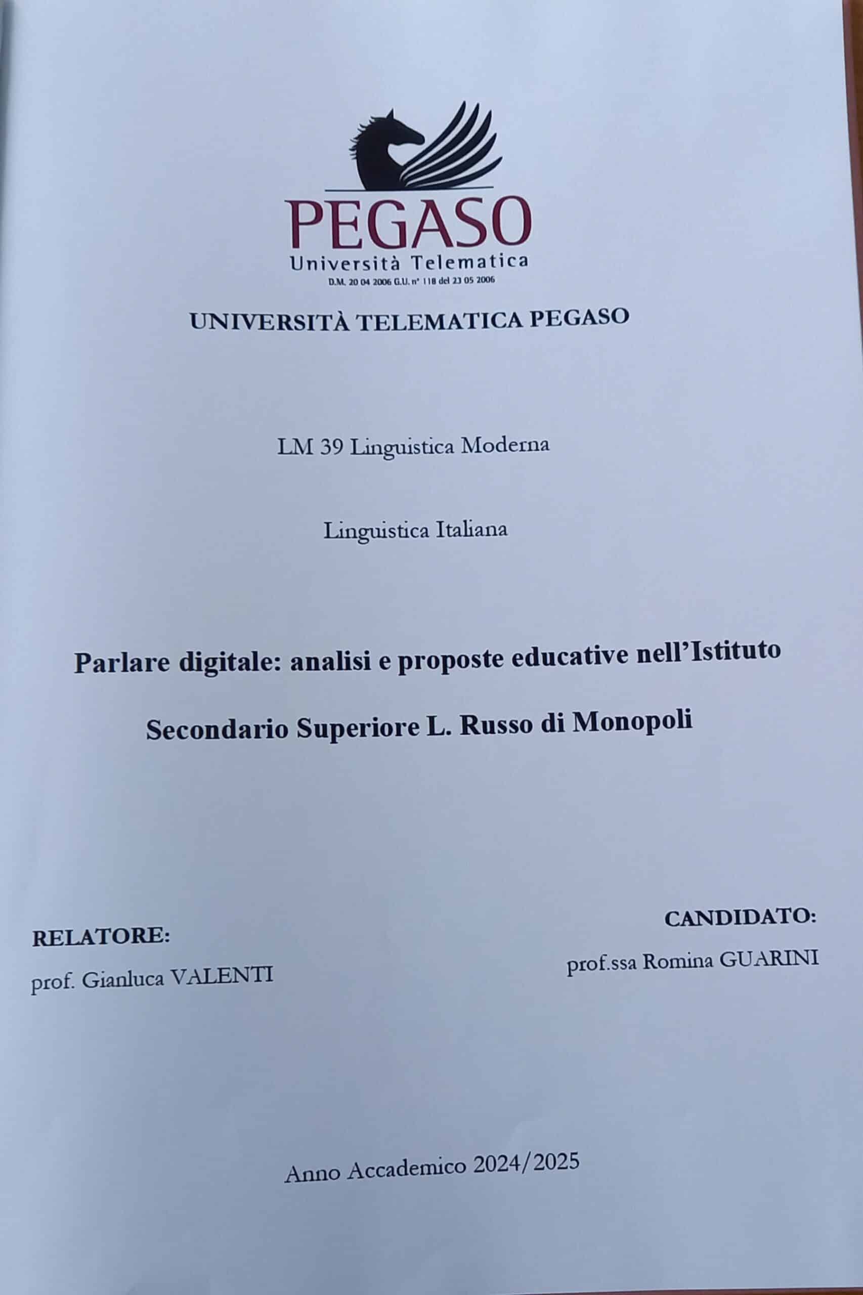 La dissertazione, intitolata “Parlare digitale: analisi e proposte educative nell’Istituto Secondario Superiore L. Russo di Monopoli”, è stata presentata dalla professoressa Romina Guarini, docente presso lo stesso istituto monopolitano.