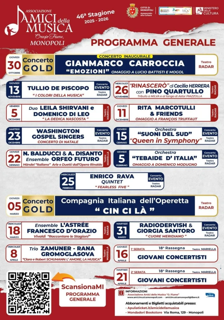 È stata presentata ufficialmente la 46ª Stagione Concertistica dell’Associazione “Amici della Musica – O. Fiume” di Monopoli, una delle rassegne musicali più longeve e prestigiose del territorio pugliese. Un traguardo importante, raggiunto anche grazie al sostegno del Ministero della Cultura, della Regione Puglia e della Civica Amministrazione di Monopoli.