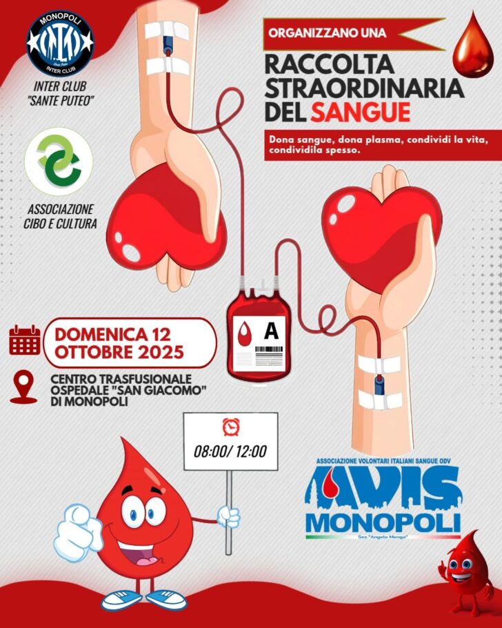 Domenica 12 ottobre 2025, dalle ore 8:30 alle 11:00, si terrà una raccolta straordinaria di sangue presso il Centro Trasfusionale dell’Ospedale San Giacomo di Monopoli, promossa da Inter Club Monopoli, Associazione Cibo e Cultura Monopoli e AVIS Comunale “A. Menga”.