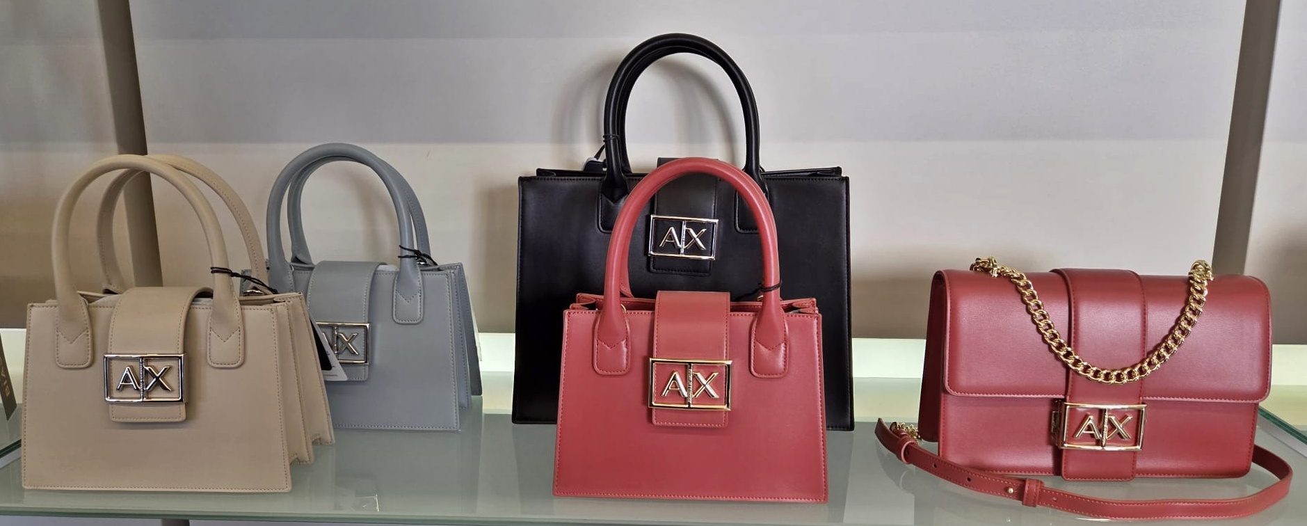 La collezione A|X propone borse a spalla, shopper, tracolle con catena e modelli a mano, arricchiti da elementi unici come: