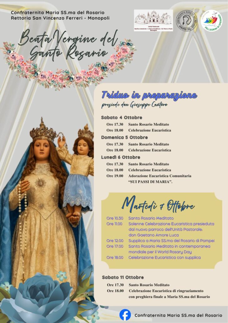 I festeggiamenti prendono ufficialmente il via oggi, sabato 4 ottobre, con l’inizio del triduo di preparazione, presieduto da don Giuseppe Cantoro, direttore del Servizio di Pastorale Giovanile della Diocesi di Conversano-Monopoli. Ogni giornata del triduo prevede alle 17:30 la recita del Santo Rosario Meditato, seguita alle 18:00 dalla Celebrazione Eucaristica.