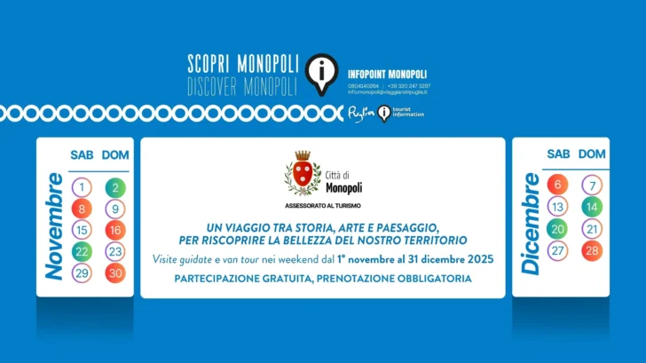 È previsto un calendario di visite guidate e van tour in programma nei fine settimana dal 1° novembre al 31 dicembre 2025, offrendo esperienze di turismo di prossimità e di carattere esperienziale, pensate per far riscoprire la ricchezza culturale di Monopoli anche durante la stagione autunnale e invernale.